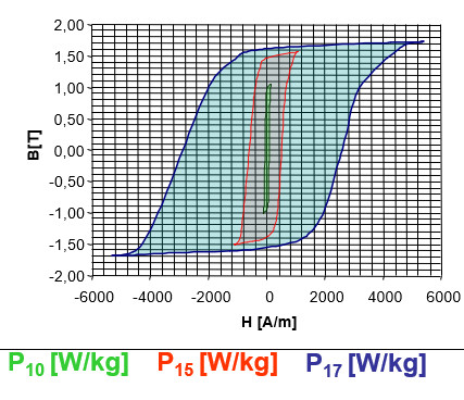 Example of hysteresis loop measured on Electrical Steel sample. Measurements performed @(50 Hz, and 1.0, 1.5, 1.7 Tesla)